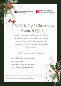 • Join the Constructing Excellence Cornwall Hub for the final event of the year to celebrate the Christmas season. The event will include opportunities for networking as well as a Christmas Quiz hosted by G4C Cornwall.